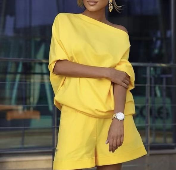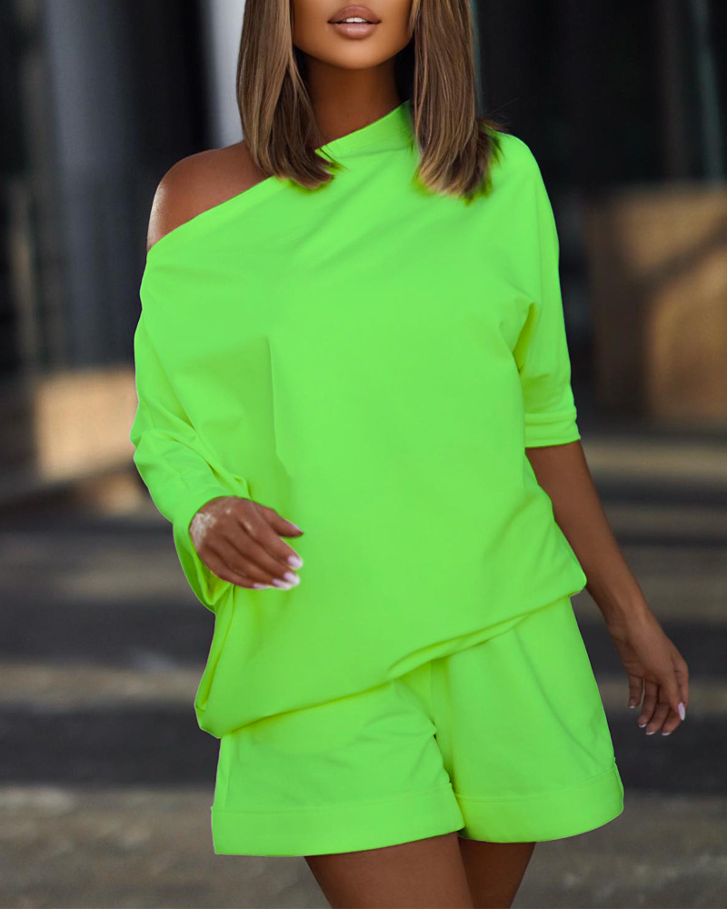 Fashion Casual Women Solid Color Long-Sleeved Cool-Shoulder Top Fashion Shorts Sets