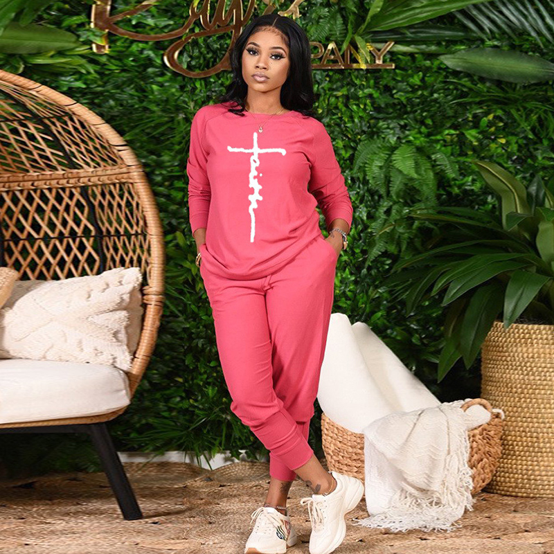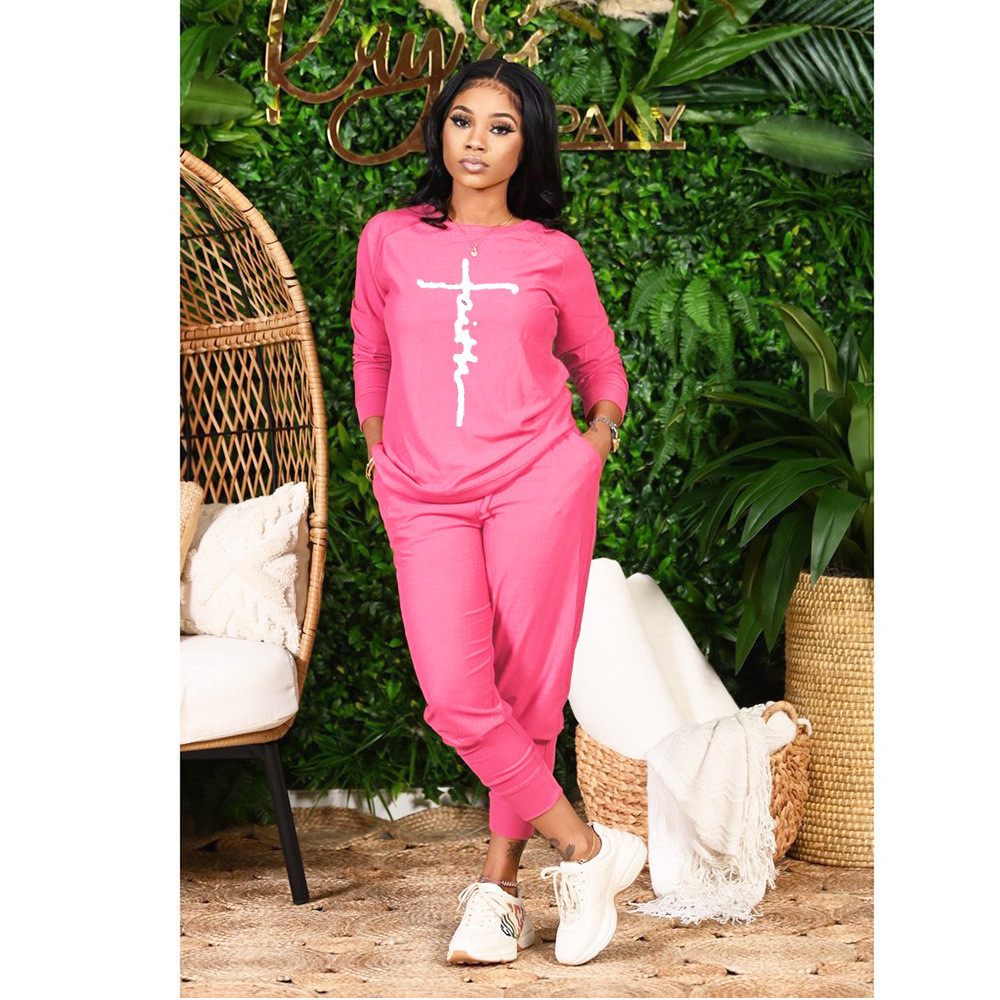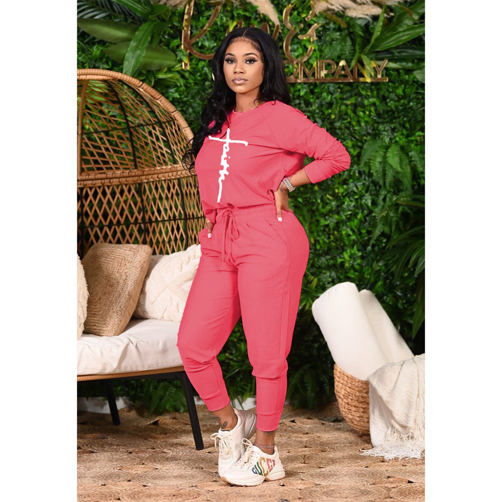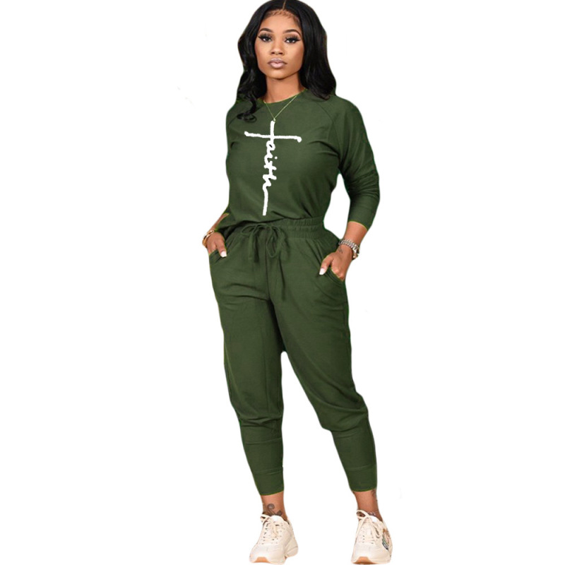Women Casual Round Neck Fashion Peace Faith Letter Printing Top And Pants Two-Piece Set