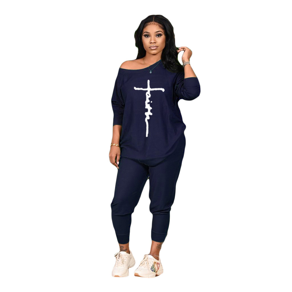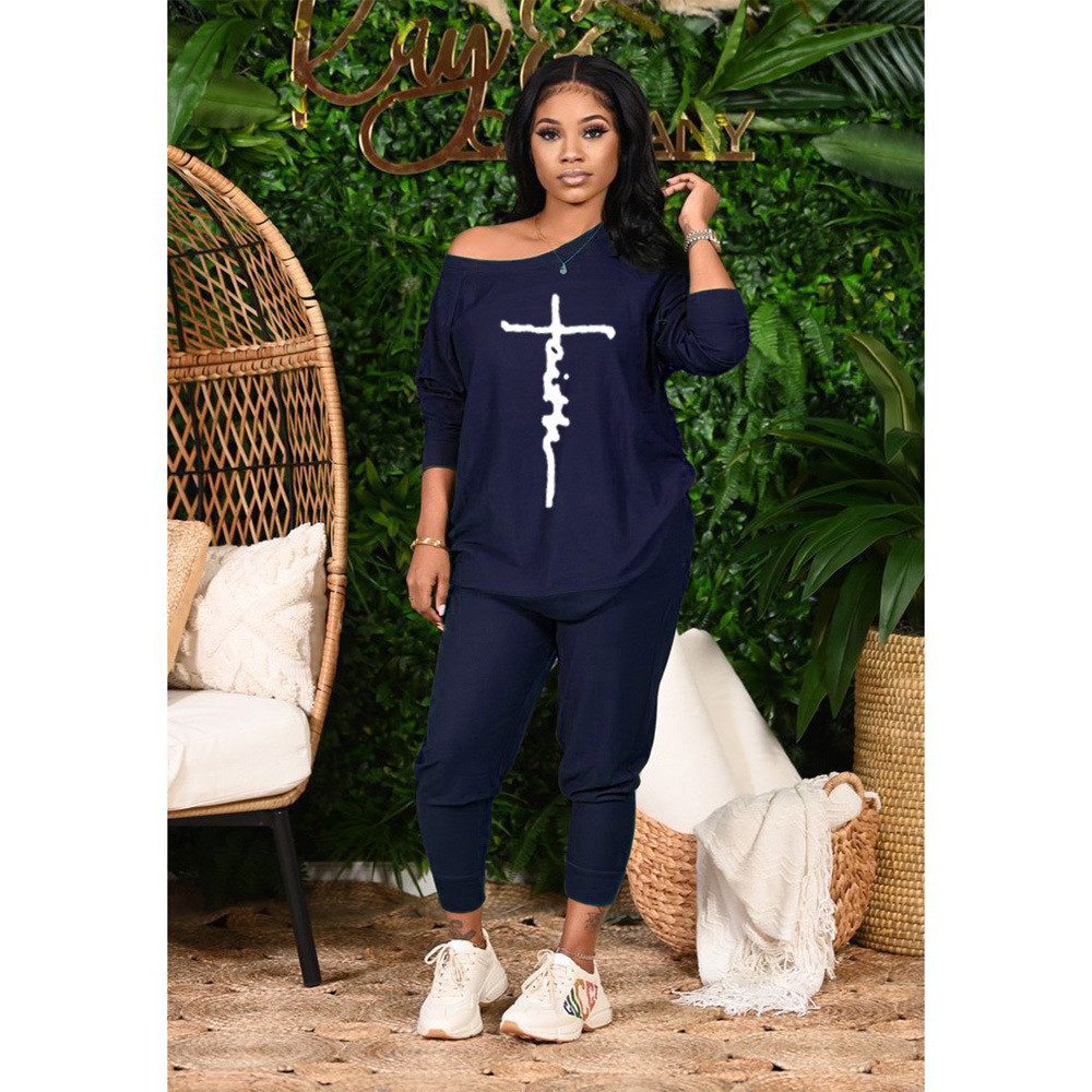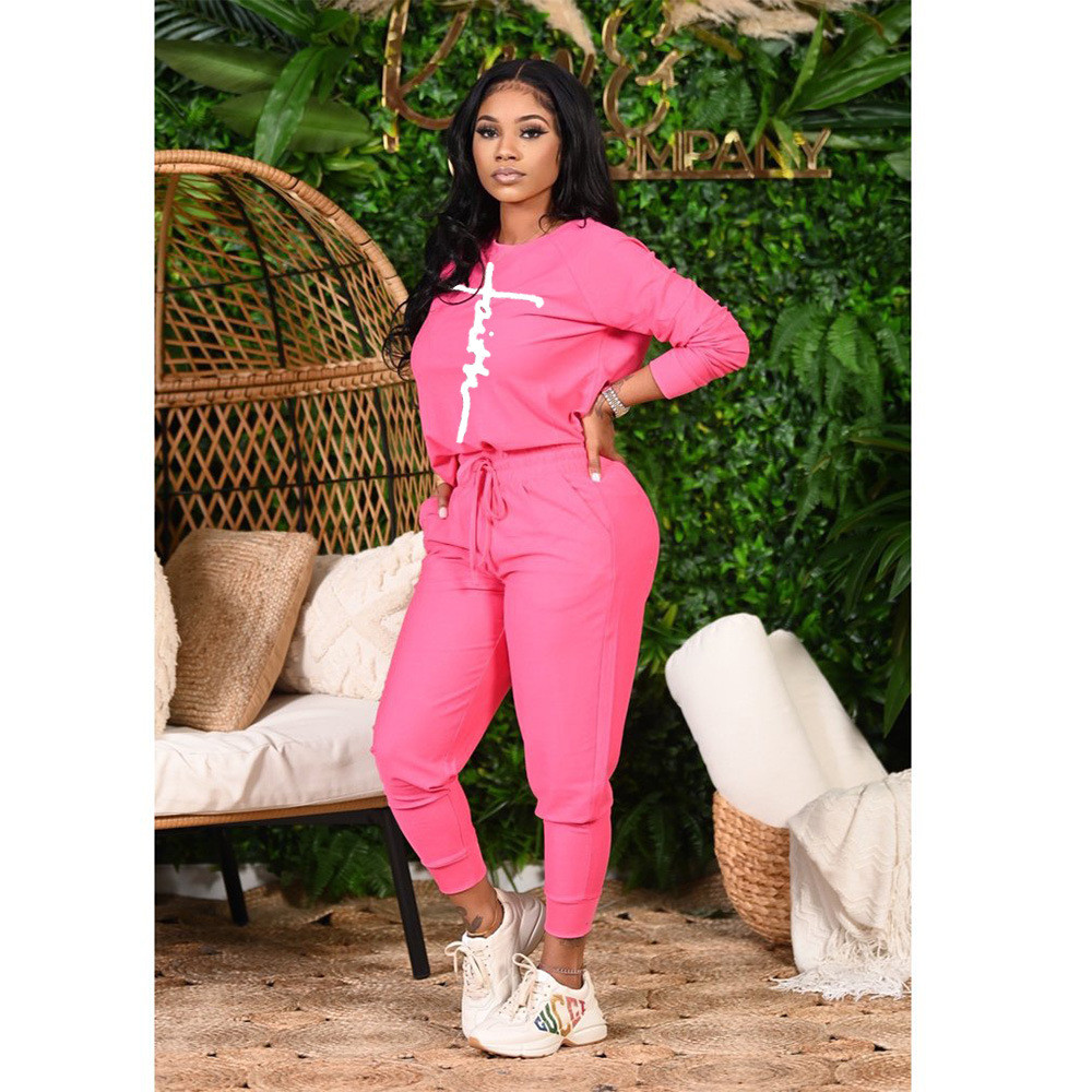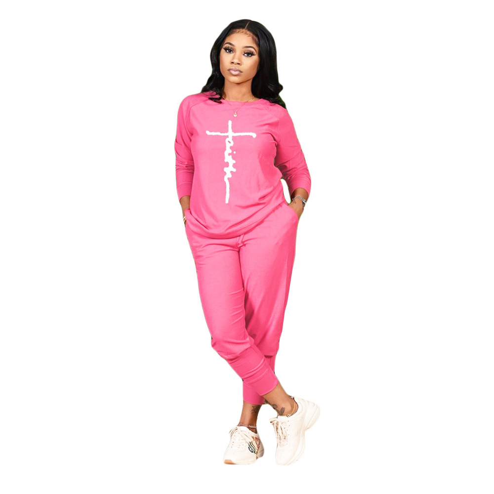 Women Casual Round Neck Fashion Peace Faith Letter Printing Top And Pants Two-Piece Set