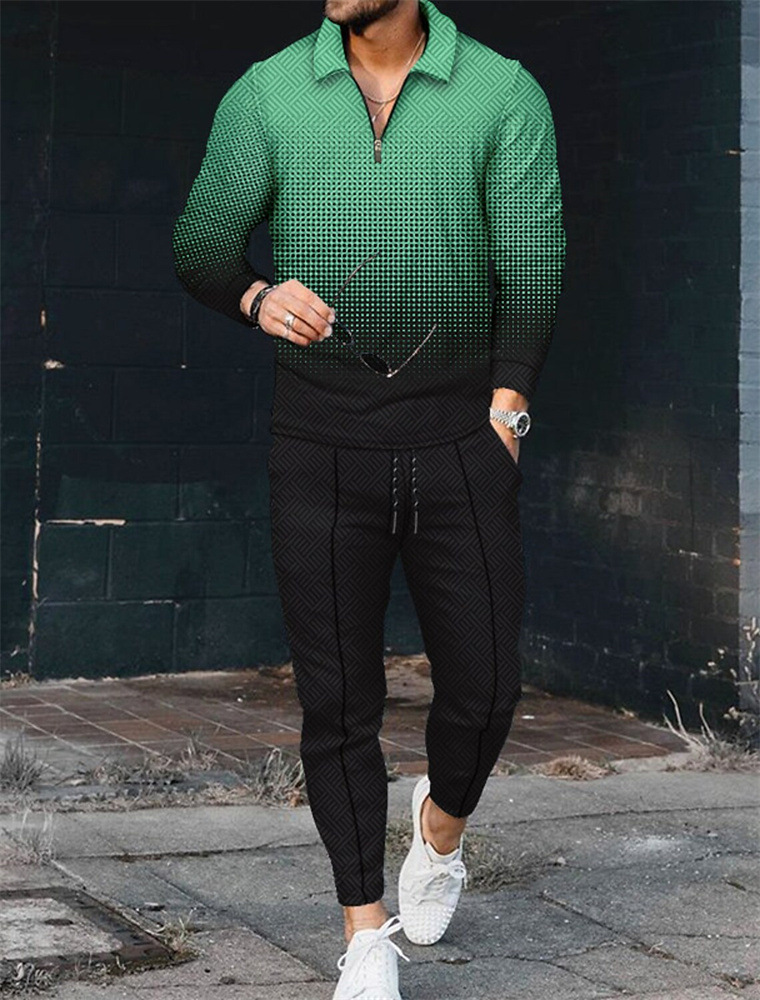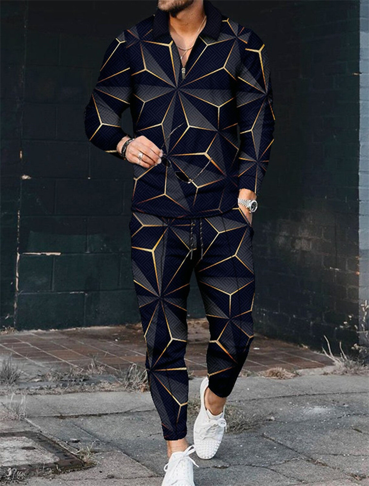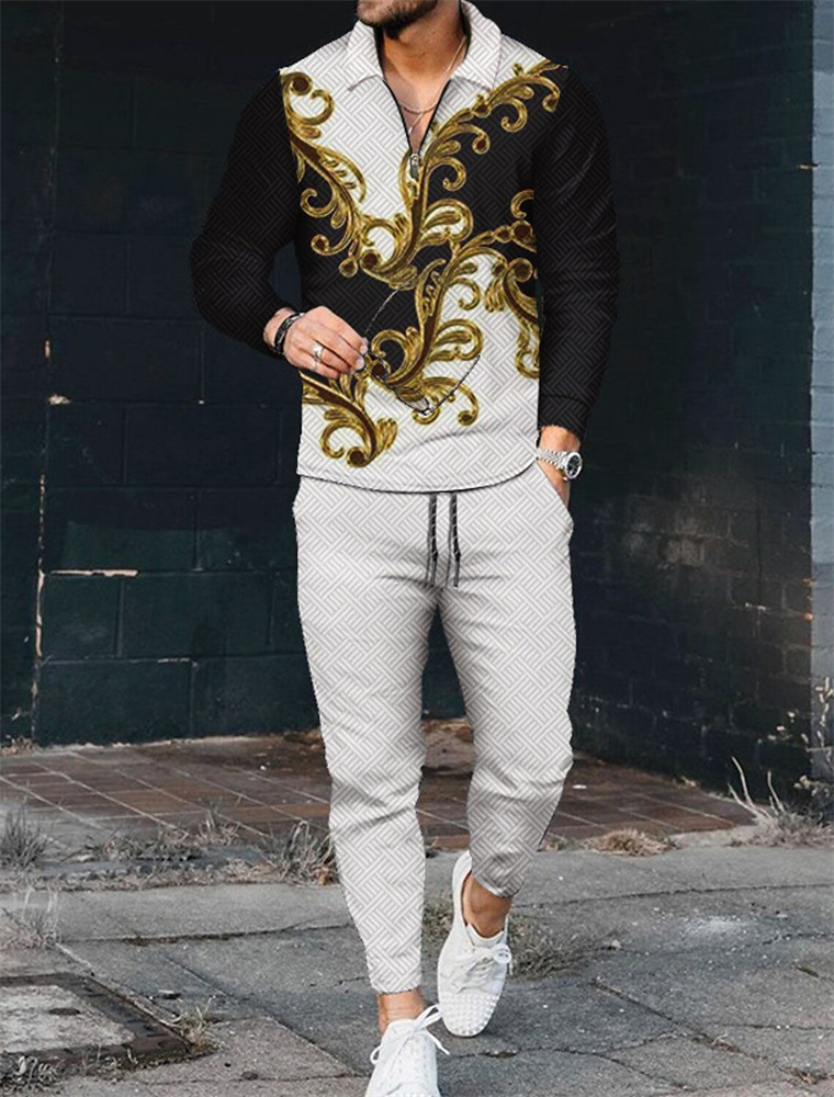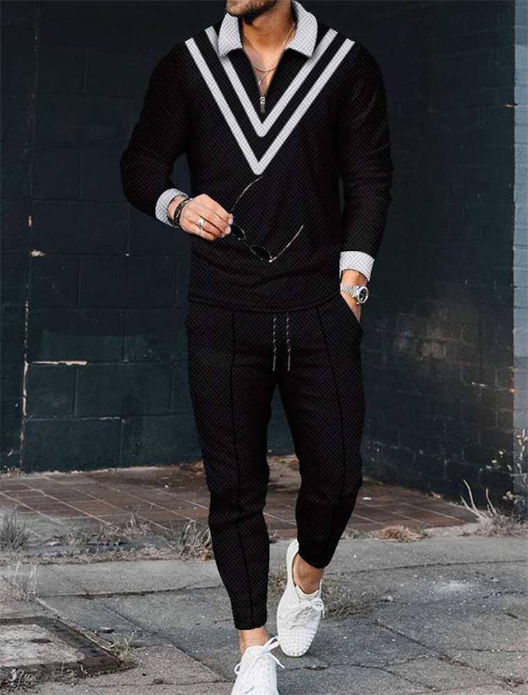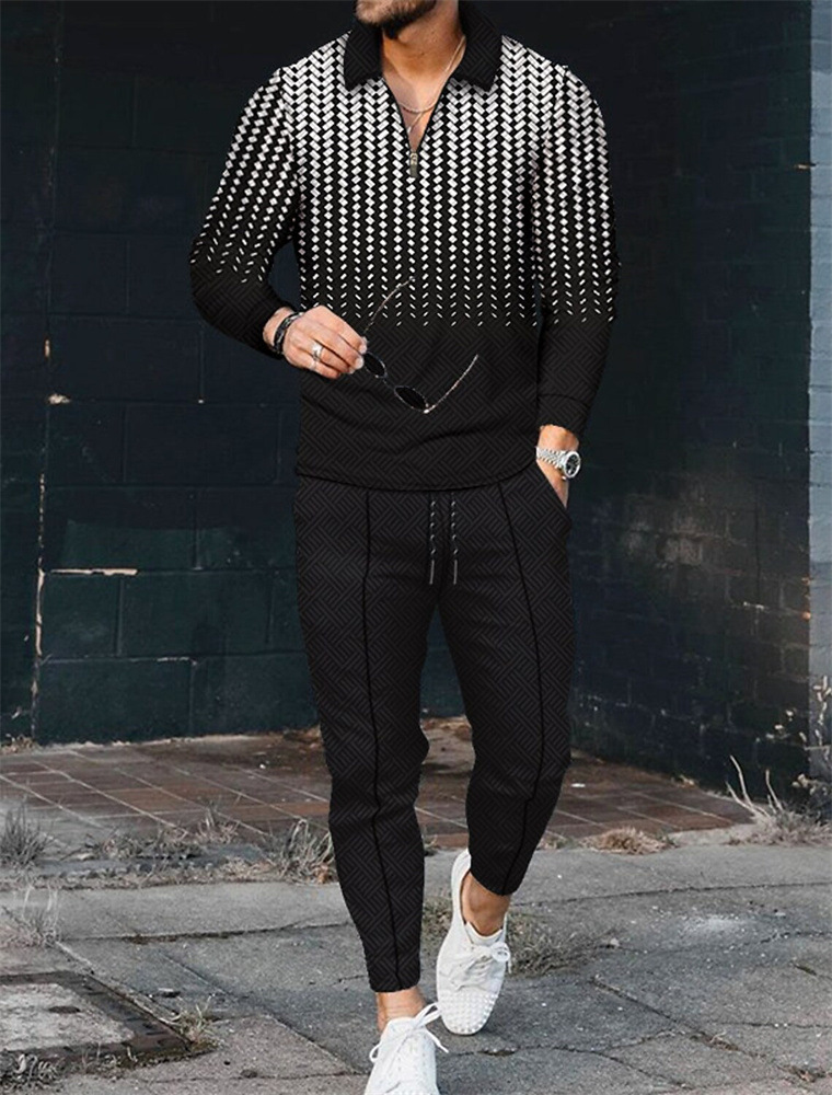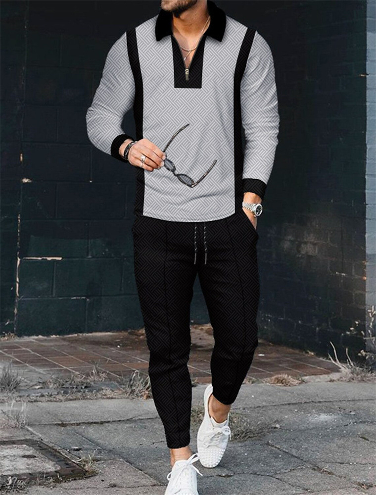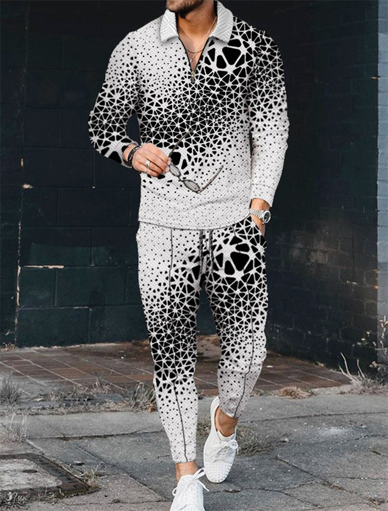 Men’S Casual Printed Lapel Long-Sleeved Sports Polo Shirt And Trousers Two-Piece Set