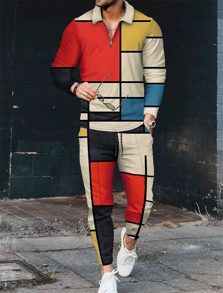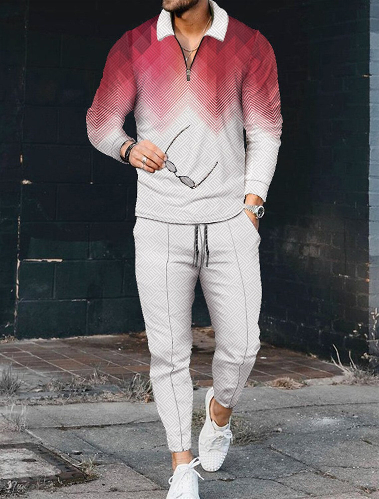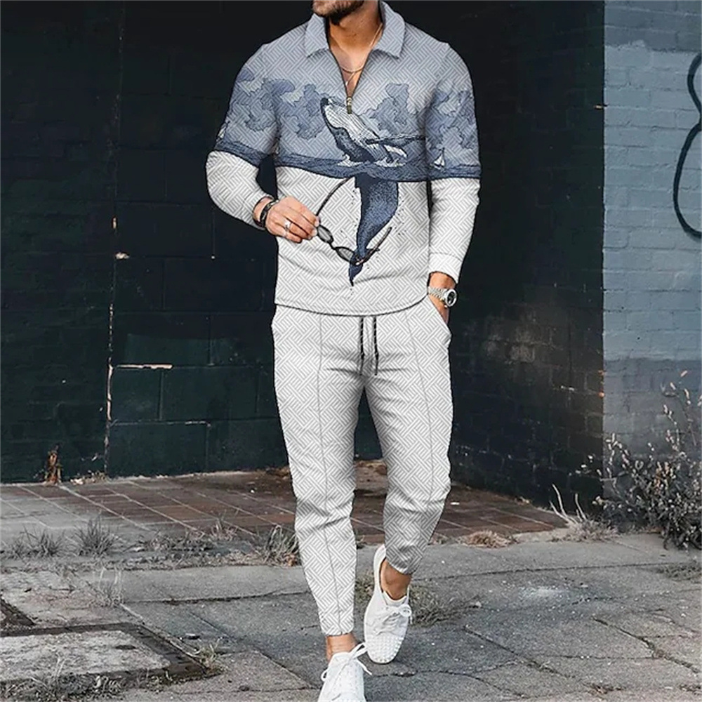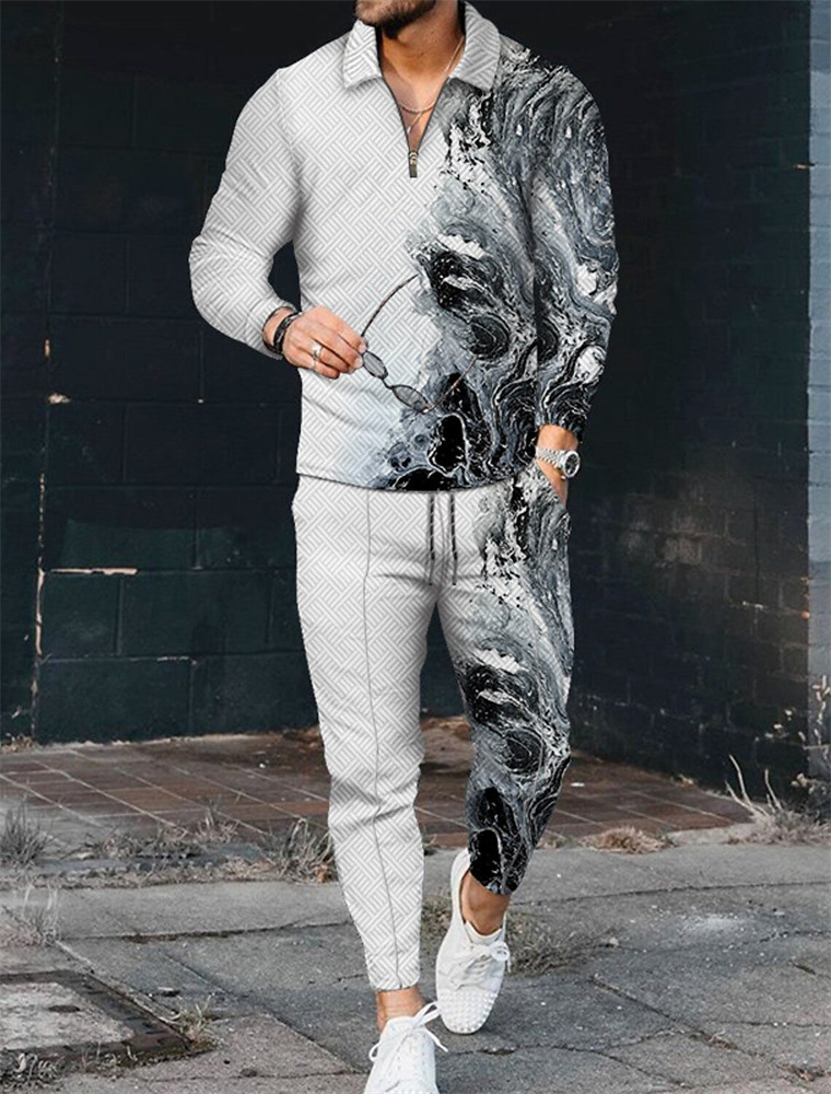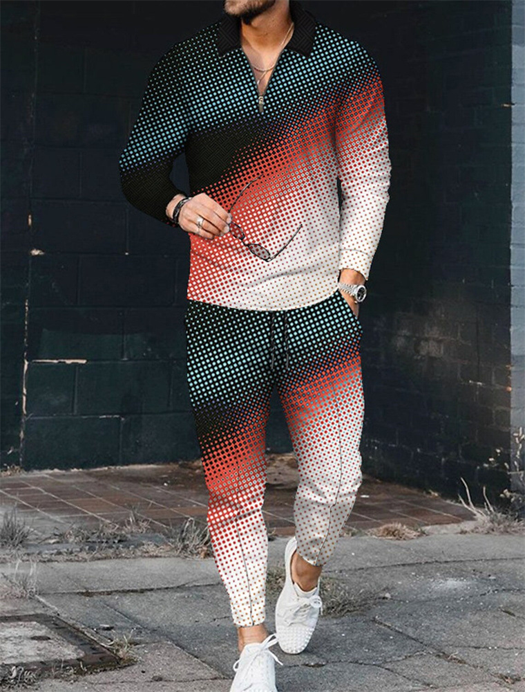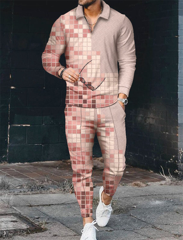 Men’S Casual Printed Lapel Long-Sleeved Sports Polo Shirt And Trousers Two-Piece Set